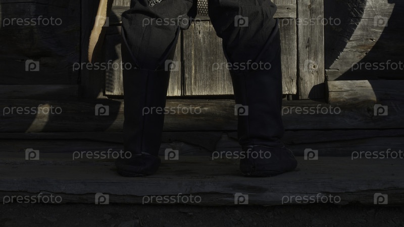 Средневековый воин с ногами в древней обуви на пороге деревянного дома СМИ Сильный древний воин