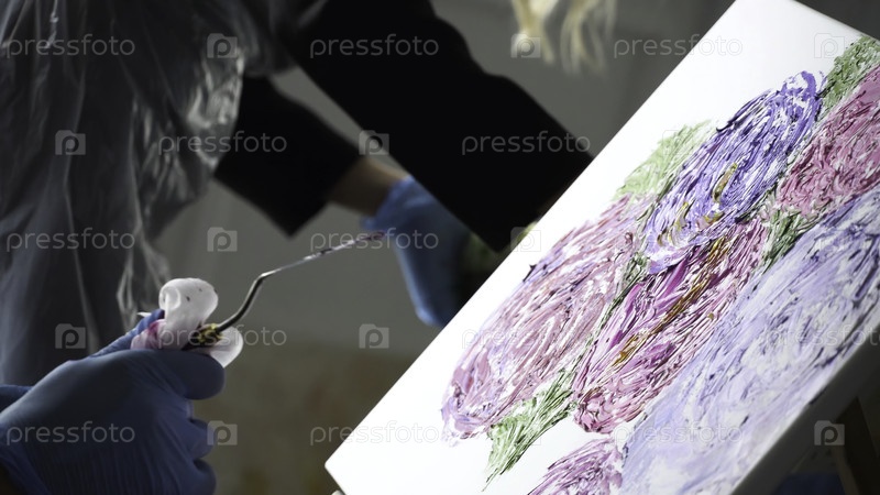Близкий профессиональный художник рисует на холсте масляные краски с помощью ножа для палитры. Стоковые кадры. Красивые штрихи масляных красок с помощью ножа для палитры создают удивительную картину