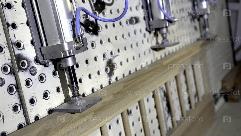 Ближайшее изображение прессовой машины для мебели. Действие. Процесс прессования современной машины на промышленном предприятии. Создание деревянной мебели на этапе соединения деталей на прессировочной машине