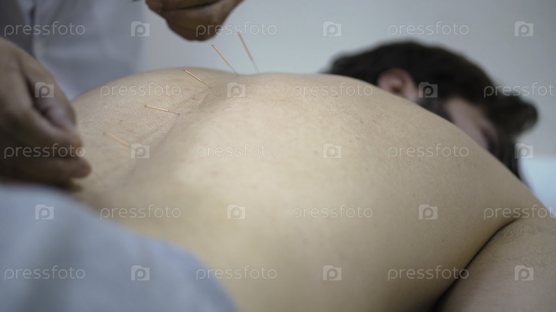 Иглоукалывание. ближайшее изображение спины человека с застрявшими иглами. китайская медицина с помощью акупунктуры. мужчина восстанавливает здоровье у профессионального массажиста по китайской медицине