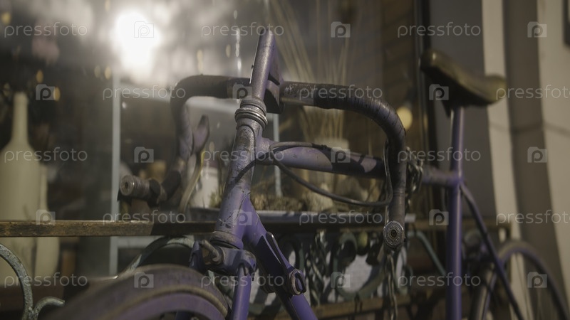 Винтажный велосипед с цепью в магазине. Акция. Антикварный велосипед стоит у окна магазина. Старый ржавый велосипед стоит снаружи здания в солнечный день