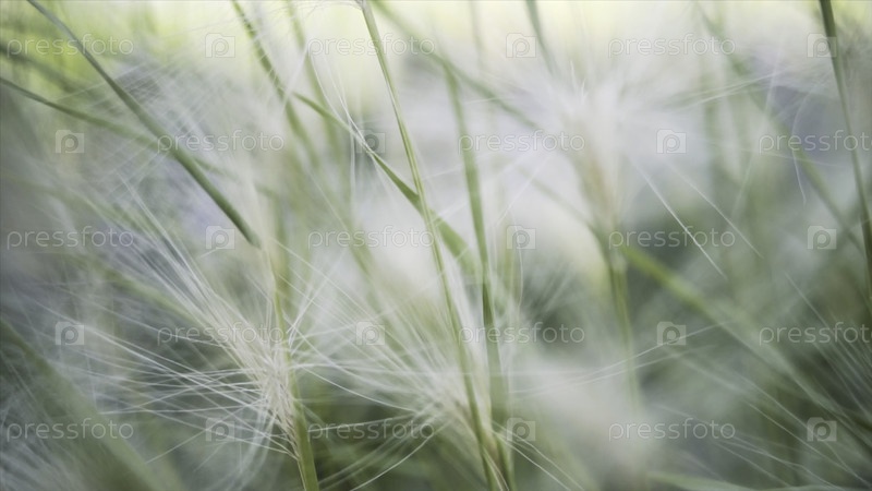 Ближайший снимок молодой зеленой перовой травы на солнце в солнечный летний день.Красивое зеленое поле пушистых цветов, красота природы