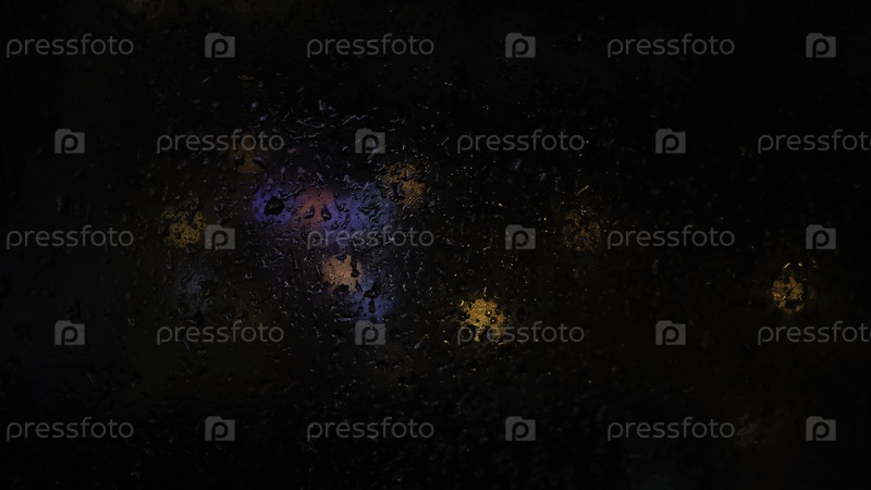 Ближайший снимок окна, покрытого капельками дождя с размытыми уличными огнями позади