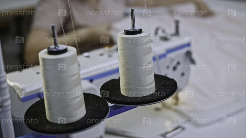 Закрытие белых швейных нитей разворачивается из катушек на швейной машине СМИ Производственное шитье в текстильной фабрике