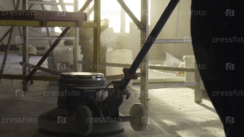 Машина для полировки полов на близком расстоянии. Реконструкция дома, шлифовка паркета, полировка. Мужчина полирует пол в комнате. Ремонт квартир в дорогом доме