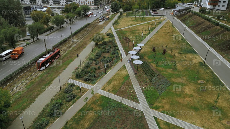 Вид сверху дорожек в парковом переулке. Клип. Солнечные батареи в парковом переулке города. Линии путей в парковом городском переулке жилого района