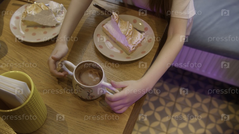 Вид сверху девушки, которая ест пирог из меренге в ресторане