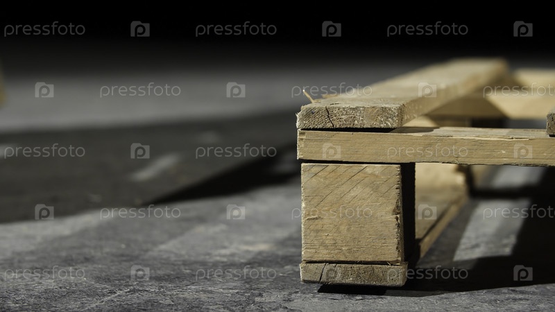 Близое изображение деревянной паллетки. Угол деревянной паллеты на сером бетонном полу. Производство мебели с использованием поддонов