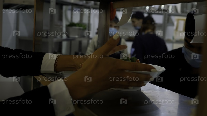 Германия - Берлин, 15 декабря 2023 года: В ресторане официант берет приготовленное блюдо у шеф-повара. СМИ. Тарелка с едой на металлической поверхности в кафе, повара на работе на заднем плане