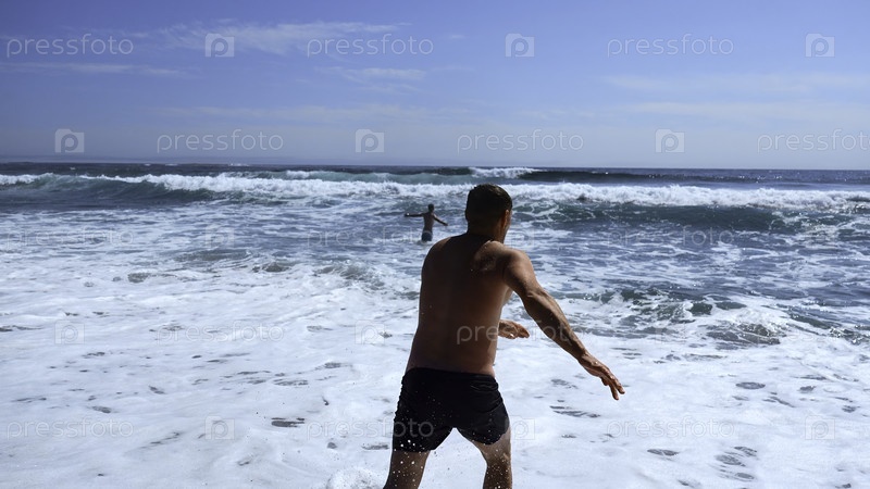 Люди купаются в красивых голубых волнах в солнечный день.Клип.Прекрасные синие волны со пеной на берегу с отдыхающими людьми.Люди в купальниках плавают с синевыми морскими волнами в летний день