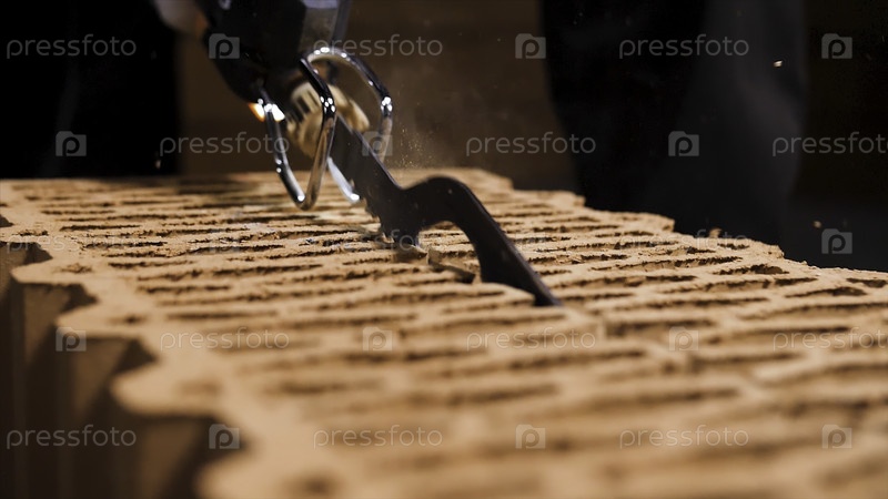 Ближайшее изображение человека, использующего электропилу для резки блока в облаке пыли.Стоковые кадры.Детали нового кирпичного дома