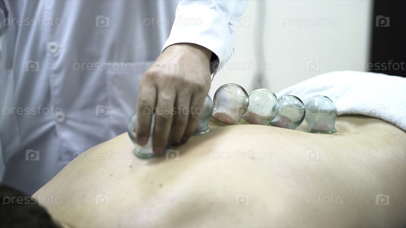 Акупунктурный терапевт кладет чашку на спину пациента-мужчины, древняя китайская альтернативная медицина
