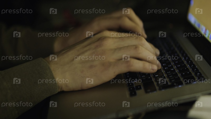 Близкий снимок мужских рук, печатающих текст или программирующих код на компьютере в естественном освещении окружающей среды поздним вечером