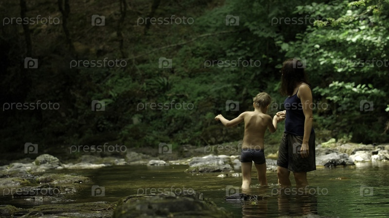 Мать и ее мальчик в лесном ручье.Креативно.Путешествие по диким джунглям в летний день