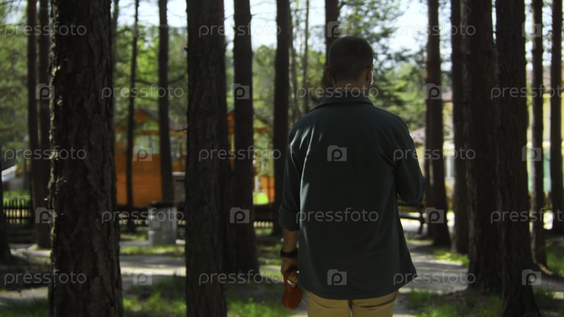 Мужчина с собакой и мячом гуляет в парке. Сток-файлы. Человек бросает собачьего мяча во время прогулки по парку летом. Мужчина ходит с собакой и мячом в солнечный летний день