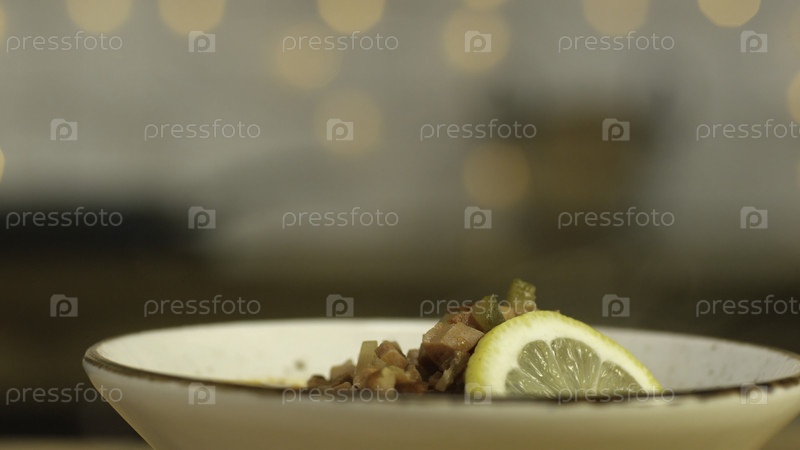 Близкий снимок руки какого-то человека, указывающего пальцем на миску сольянкой. Скриншоты. Русский суп солянки с мясом, колбасой и оливками