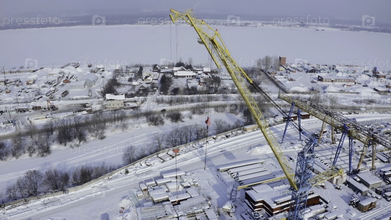 Промышленный воздушный фон с краном на строительной площадке. Клип. Зимний замерзший пейзаж, концепция тяжелой техники
