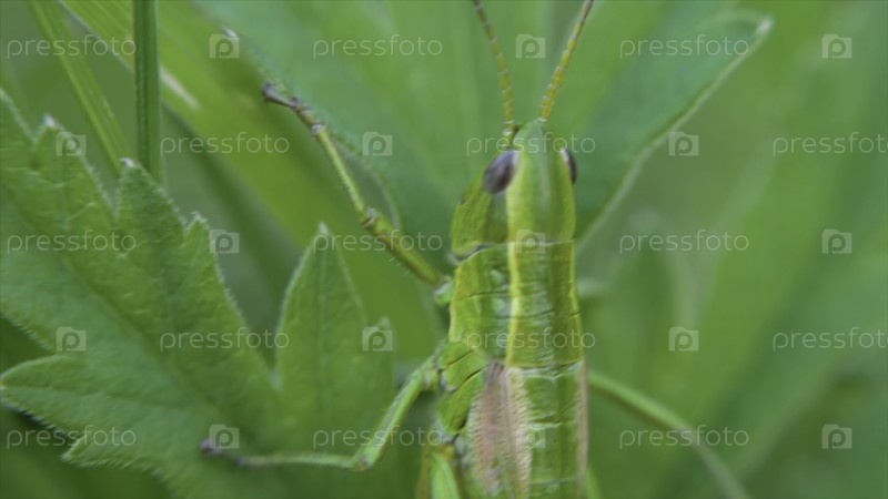 Саранча. саранча на листьях. клип. саранча на листочке травы вблизи поля. зеленая саранча. макро-визуализация