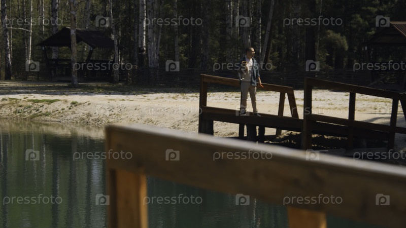 Человек с собакой на пирсе озера. Скриншоты. Прекрасное озеро с пиром и мужчина, держащий собаку в руках. Расслабление с собакой на летнем озере в лесу в солнечный день