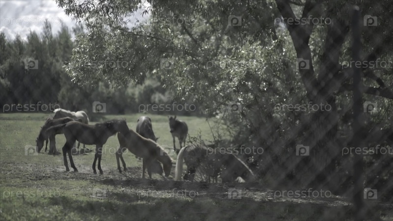 Крупный рогатый скот в загоне. Лошади, питающиеся травой внутри загона. Пастбище лошадей - это пастбище