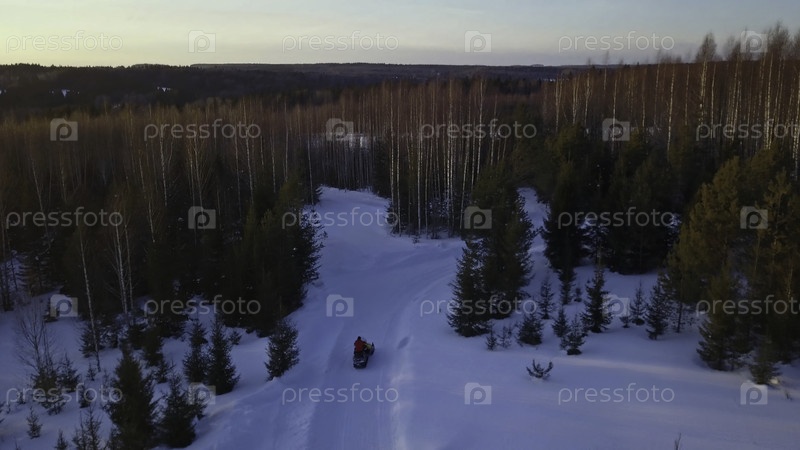 Вид зимнего пейзажа из вертолета. Клип. Зимний лес с лысыми деревьями, в котором люди ездят на мотоциклах и яркие лучи солнца видны. Высокое качество 4k кадры