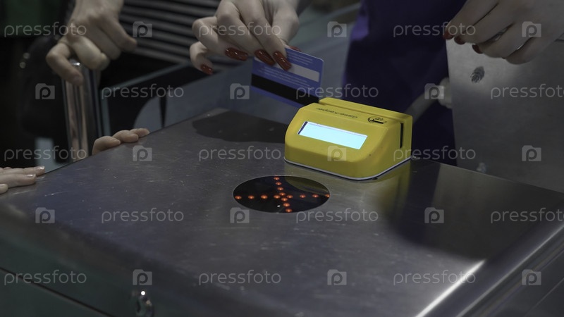 Входный турникель с оплатой банковской картой. Клип. Близкий план женщины, прикладывающей карточку к турникелю. Покупка билета через турникель с использованием банковской карты