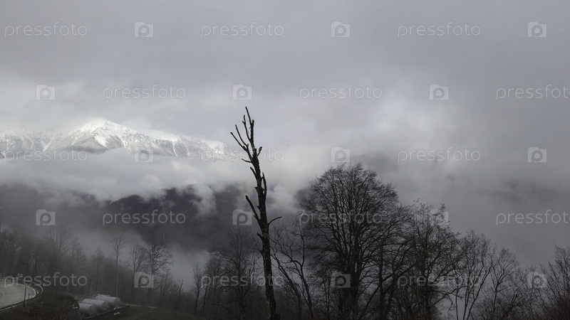 Прекрасный зимний пейзаж с заснеженными вершинами, окутанные туманом, мистическая снежная гора, покрытая туманом и лысыми деревьями