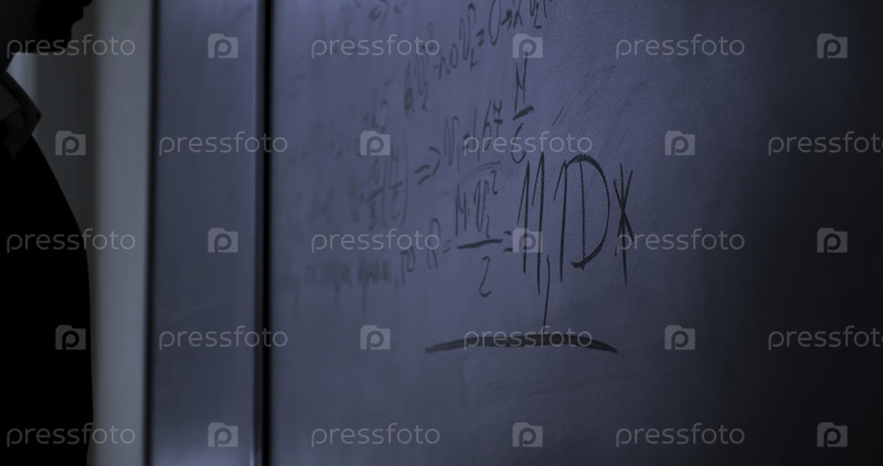 Ученый стоит рядом с формулами на черной доске