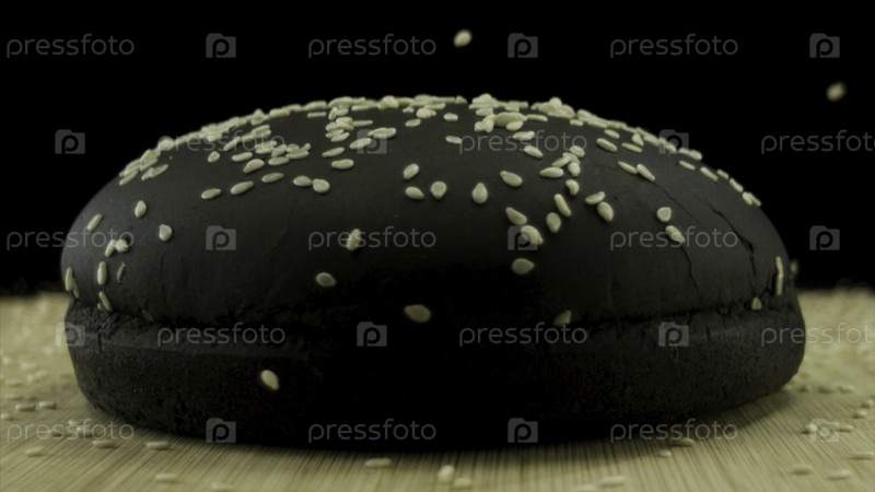 Ближайший снимок сусамовых семян, падающих на черный бутерброд изолированный на черном фоне. концепция еды и западной кухни