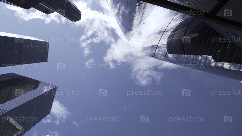 Вид снизу на вершины стеклянных небоскребов на фоне синего неба. Действие. Современная архитектура бизнес-центров, отражающая голубое небо. Головокружительный вид на современные стеклянные небоскребы