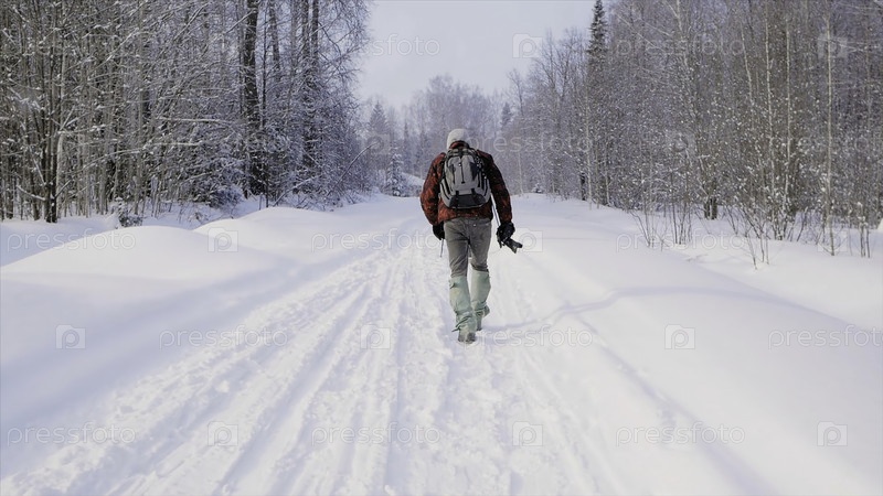 Путешествие и походы по лесной тропе в зимний сезон. Клип. Молодой человек, идущий по лесу с камерой - Концепция приключений, трекинга и сезонного отпуска со задним видом туриста на тропинке