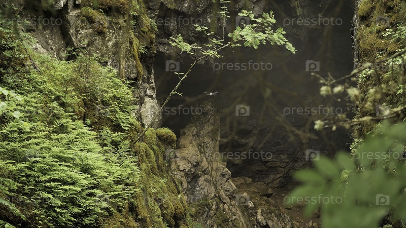 Дрон летает на открытом воздухе на летном зеленом лесном фоне. Скриншоты. Квадрокоптер, летящий перед крутой скалой в лесу