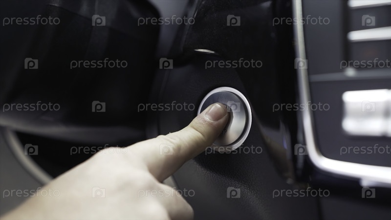 Водитель рукой нажимает кнопку старта и остановки двигателя. Современные детали интерьера роскошного кроссовера