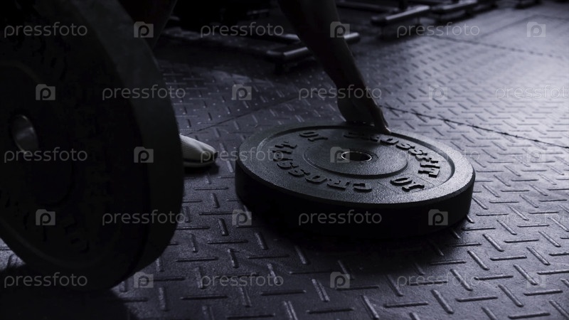 Мужчина, берущий фитнес-оборудование из тренажерного зала с планкой весов штанги на полу, спортивная концепция