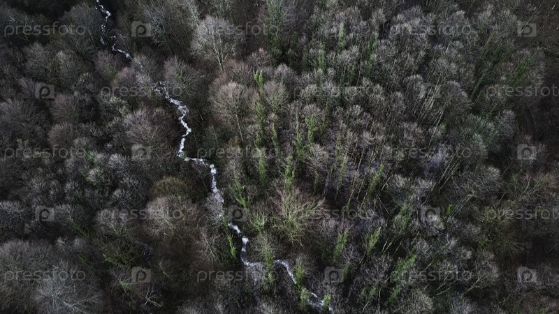 Вид с воздуха на реку, протекающую через густый смешанный лес в Швейцарии. вид сверху вершины деревьев и быстрый узкий ручей