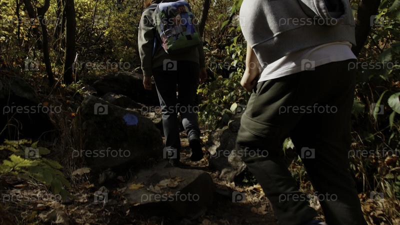 Сзади изображение группы пешеходов, поднимающихся по каменистой тропе в зеленом летнем лесу.Креативность.Лесные холмы и люди, концепция приключений
