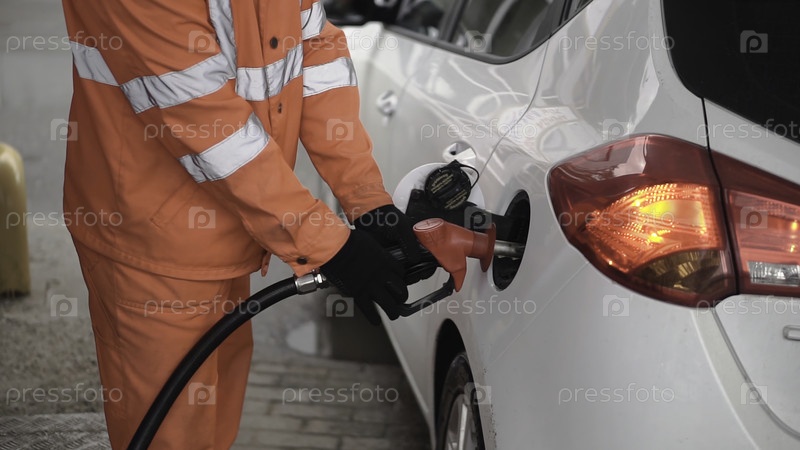 Работник бензоколонки заправляет машину на автозаправочной станции