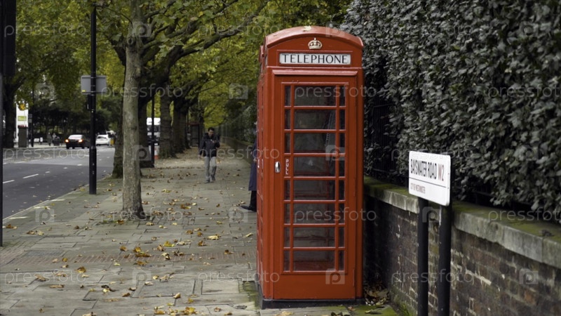 Лондон, Великобритания-сентябрь 2019: Красная телефонная будка на улице с деревьями и людьми. Действие