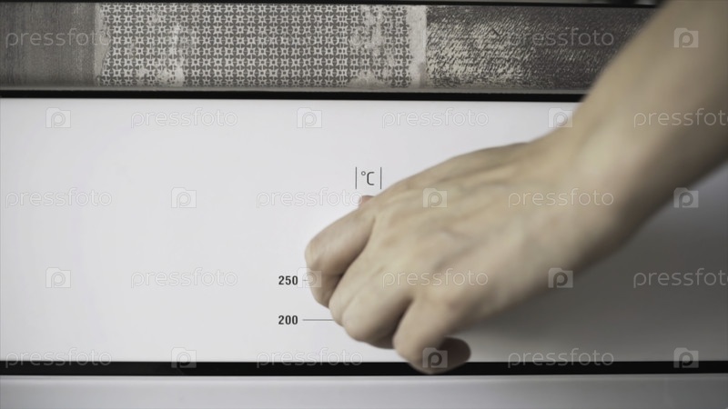 Женская рука, использующая элементы управления печью для настройки уровня тепла в духовке. Ближайший снимок женской руки, вращающей контроллер для установки температуры, концепция приготовления пищи
