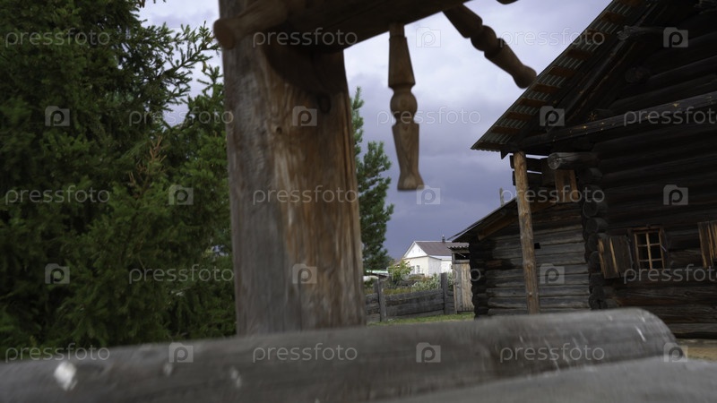Деревянный колодец и старые дома СМИ.Старые деревянные здания в деревне Рустические деревянные здания в Музейном заповеднике истории