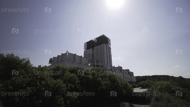 Москва, Россия, летний город и здание Президиума Российской академии наук. Действие. Красивые зеленые деревья и здание с необычной структурой на крыше