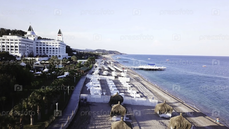 Вид с воздуха на волны, песчаный пляж с тростниковыми зонтиками. видео. вид сверху песчаного пляжа с природными зонтами