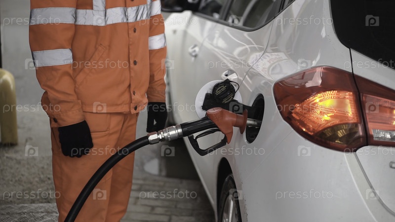 Работник бензоколонки заправляет машину на автозаповеднике