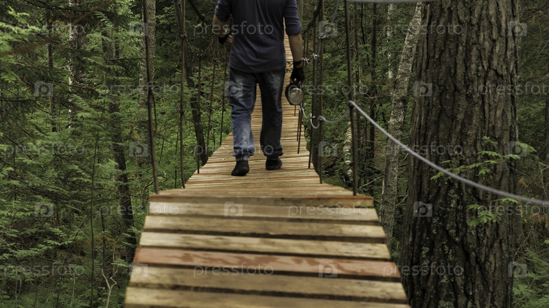 Пешие прогулки в зеленых тропических джунглях, Центральная Америка. Сток кадры. Задний вид человека с металлическим термосом в руке пересекает деревянный висячий мост, окруженный зеленым лесом
