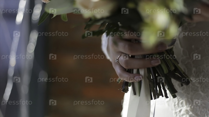 Красивый свадебный букет в руках молодой невесты, одетой в белое свадебное платье. Рука невесты касается брачного букета. Близкий снимок большого гроба свежих белых роз и цветов тюльпанов в женских руках. Анонимная невеста держит цветы