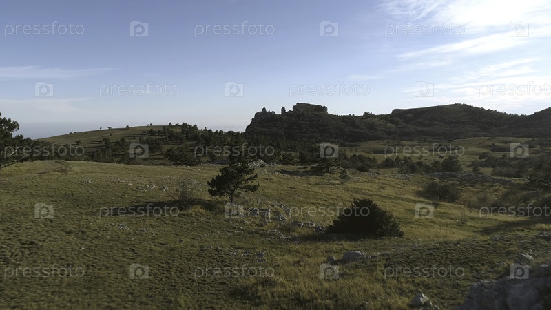 Травянистые холмы с хвойными деревьями. выстрел. солнечный, чистый день