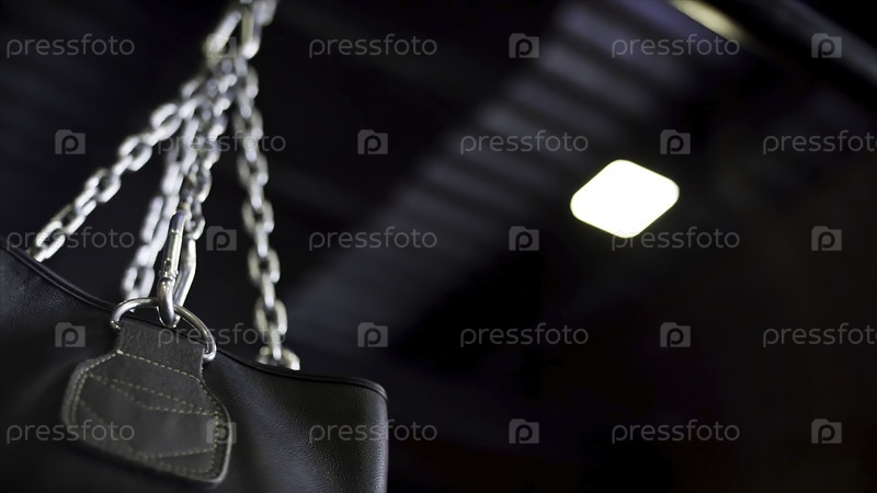 Близкий взгляд на серебряную цепь и раскачивающийся черный боксерский пакет, действие, спортивная концепция