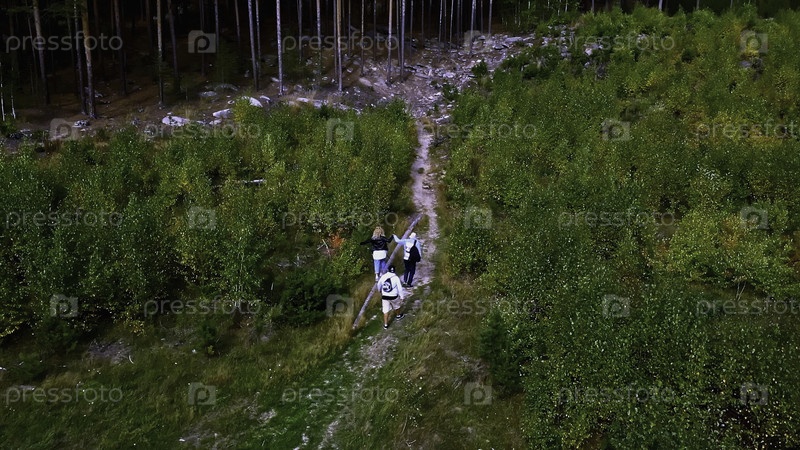 Счастливые друзья гуляют по летнему лесу. Кадр. Аэрофотосъемка похода на зеленой тропе, концепция активного образа жизни