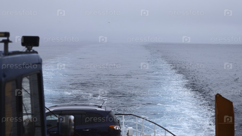 Корабль с автомобилем плывет в море в пасмурную погоду. Клип. Плавание на пароме с автомобилем в море. Вид линии, оставленной парусным судном в море в пасмурный день