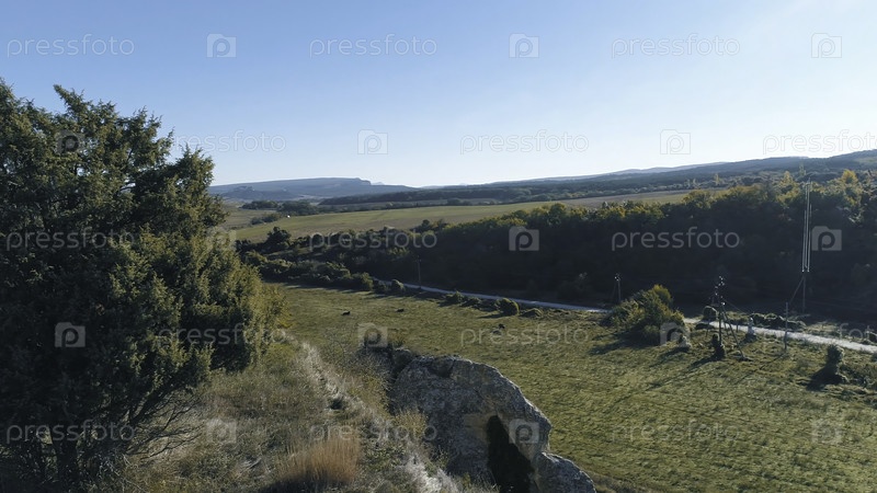 Травянистые холмы с хвойными деревьями. выстрел. солнечный, чистый день